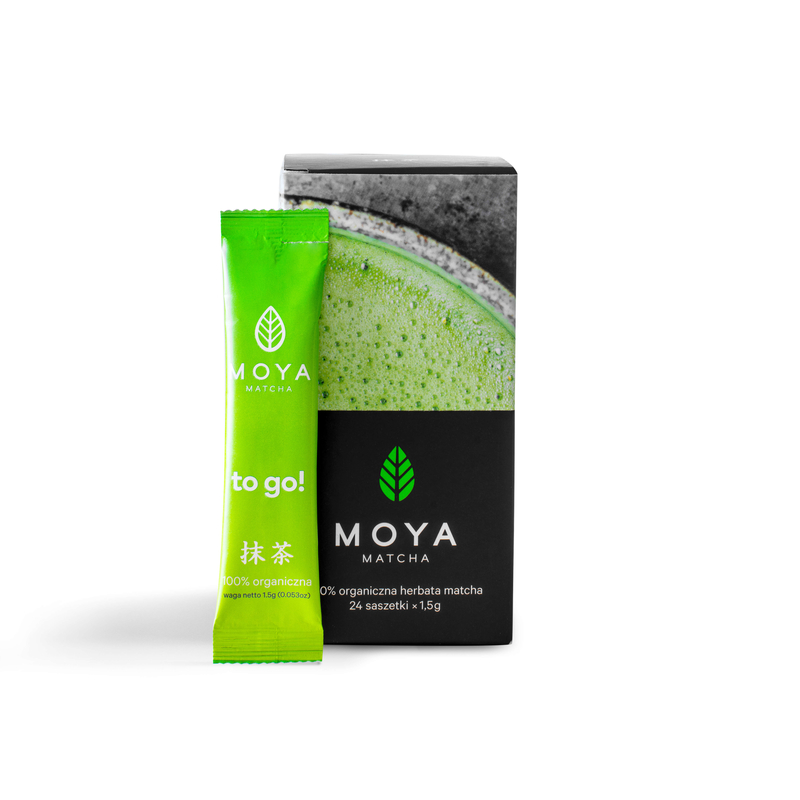 Moya Matcha To Go! являє собою зручну форму органічного традиційного чаю Moya Matcha, упакованого в одноразові стіки, які можна приготувати в гарячому або холодному вигляді. Moya Matcha To Go! упакований в коробки, що містять 24 стіки x 1,5г органічної матча. Найкраще змішувати в скляному шейкері Moya Matcha.